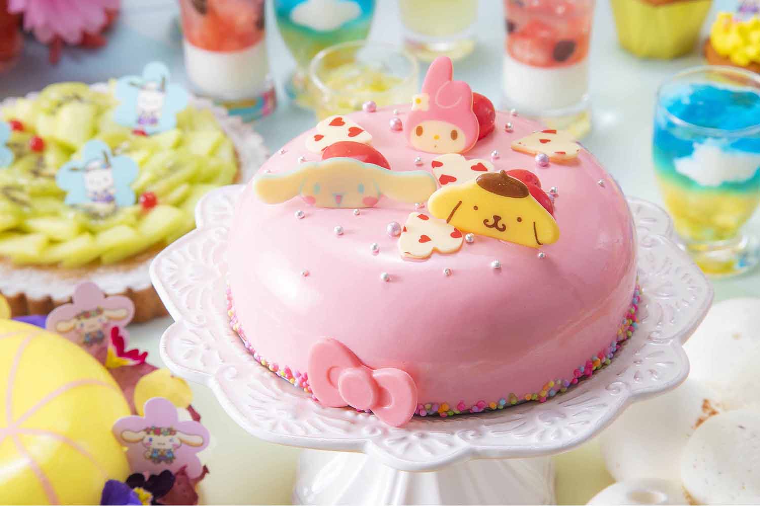 「マイメロディ」、「ポムポムプリン」と「シナモロール」の顔型チョコをのせた「ジョイフル・ピンクケーキ ライム&ラズベリー」は、ホワイトムースとラズベリーコンポートにライムの爽やかさが口の中で溶け合う優しい味わい。