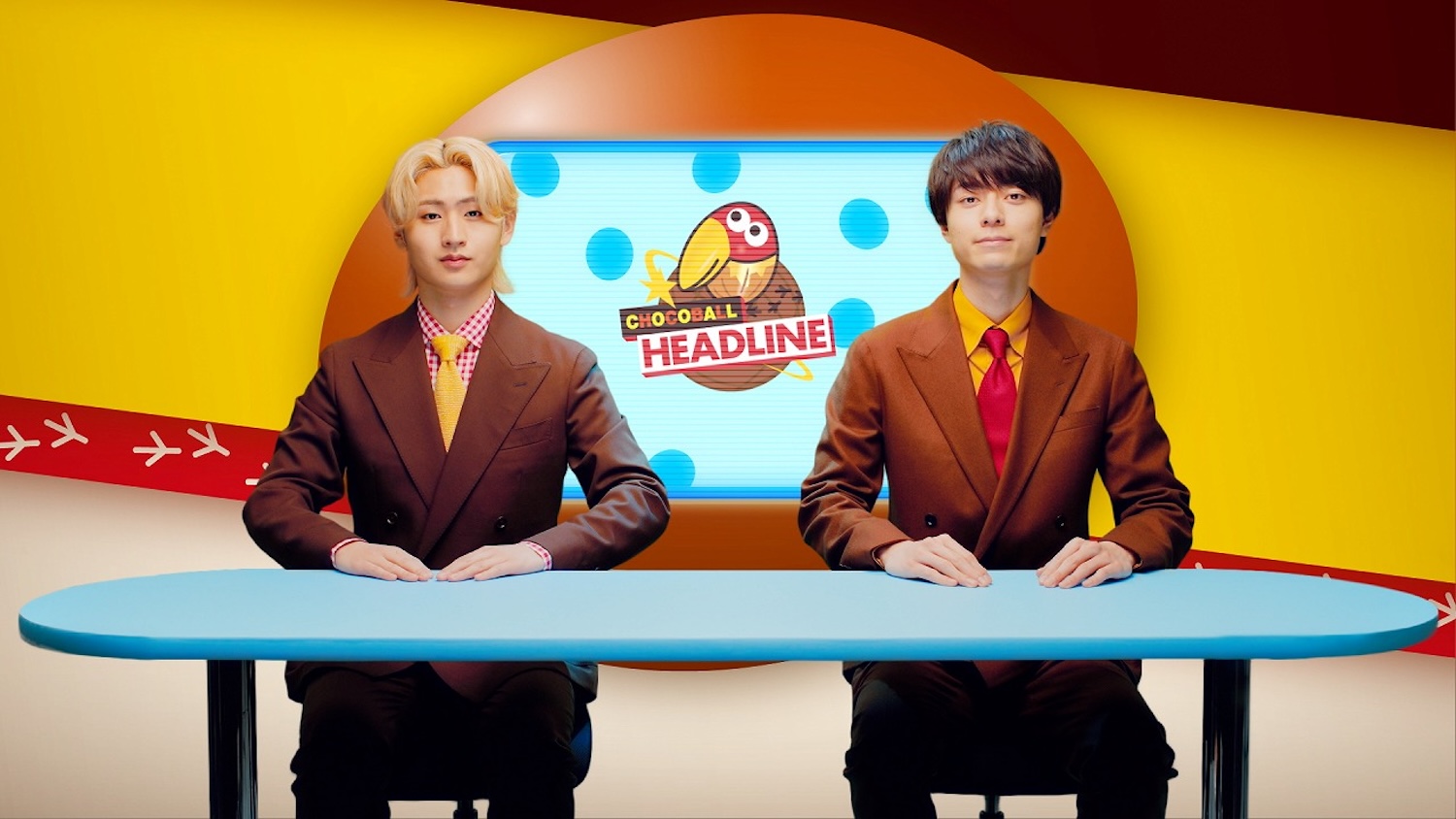 昨年「おもちゃのカンヅメ」のTVCMに初出演した猪狩蒼弥と作間龍斗が、チョコボールカラーのスーツを着たニュースキャスターとなり、チョコボールの様々な話題をお届けするWebニュース番組『チョコボールヘッドライン』。