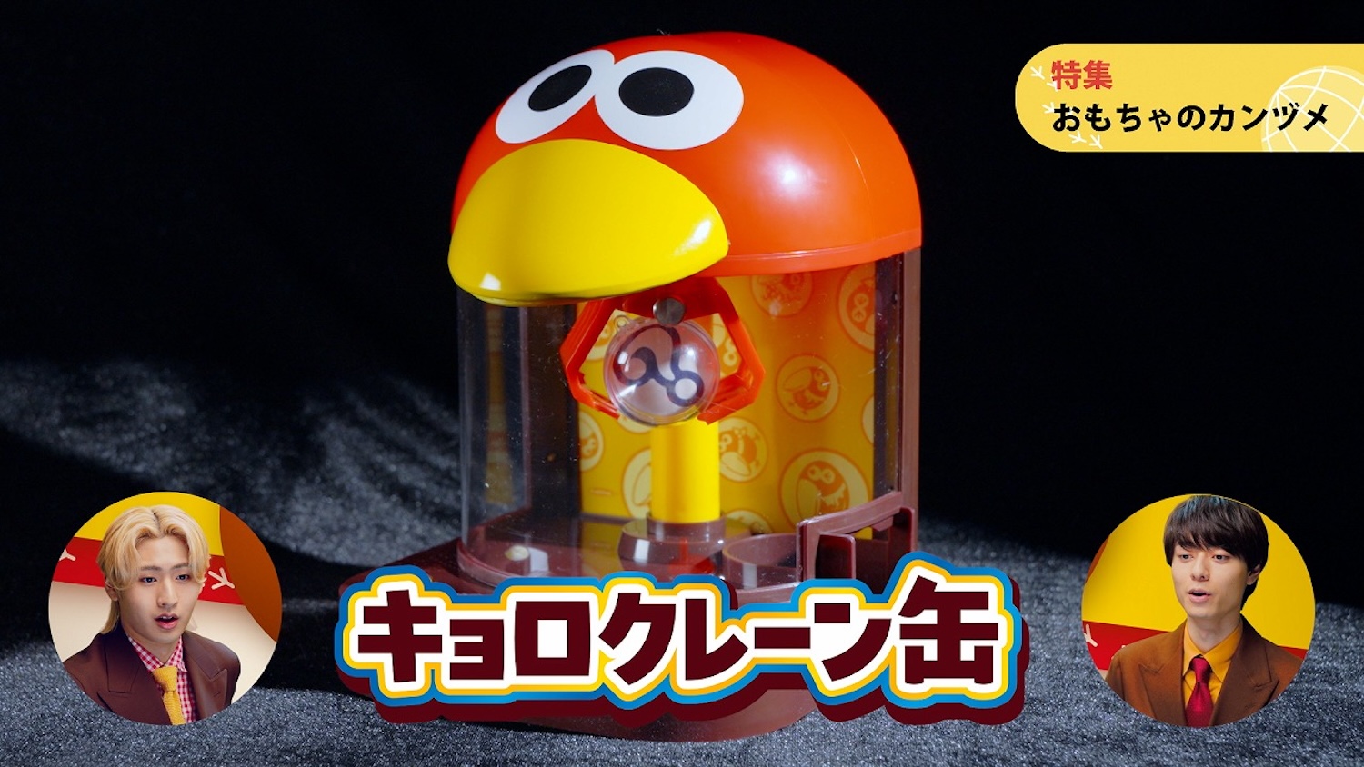 続いて、今回特別に調査チームがその秘密が知れる場所(森永エンゼルミュージアムMORIUM)に潜入。厳重な警備体制の中、アタッシュケースに入った新作の「おもちゃのカンヅメ」がお披露目される。それを見た猪狩と作間が「なにこれ!?」「うおー!カンヅメ!?」と声を上げる中、『これが今のおもちゃのカンヅメだ。今年新たに登場する、缶そのものがクレーンゲームになった「キョロクレーン缶」』のナレーションに、猪狩は「なんか、思ってたカンヅメの形と違うね!クレーンゲームになってるんだ!」、作間も「カンヅメってこんな感じだったっけ!? へー!すごいね!」と驚きを隠せない様子を見せる。さらにナレーションが、『そして、昨年登場したガチャガチャタイプの「キョロガチャ缶」だ。今なら好きな方を選んで貰える』と続き、「好きな方を選べるの嬉しいですね!」「どっちも欲しいけどね!」と喜び、最後にクエックエックエッ・・チョコボール〜♪というお馴染みの曲が流れ、映像がスタジオに戻る。猪狩と作間が丁寧にお辞儀をする中、見切れているキョロちゃんの姿が映し出され、ニュースは終了するというもの。