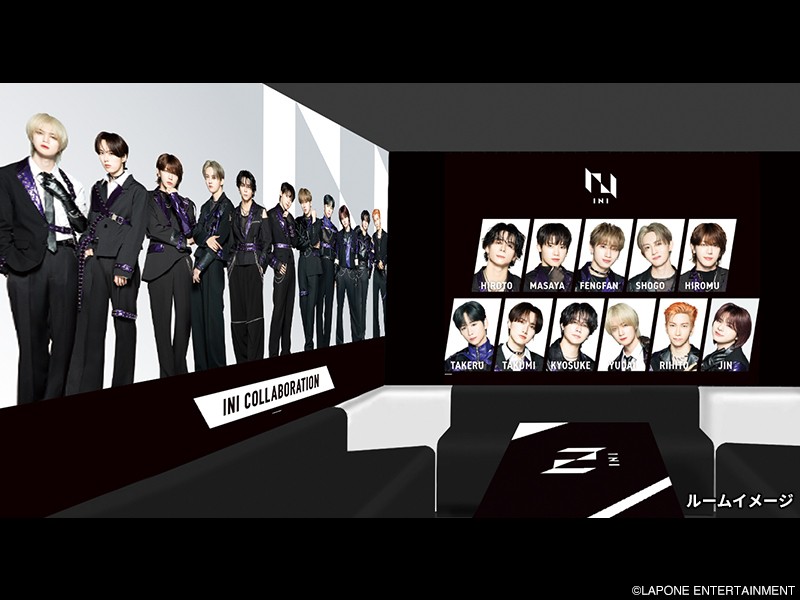 本コラボのために特別に撮り下ろした「INI」の新ビジュアルを採用し、カラオケルーム一面にデザインした「コラボルーム」を展開。