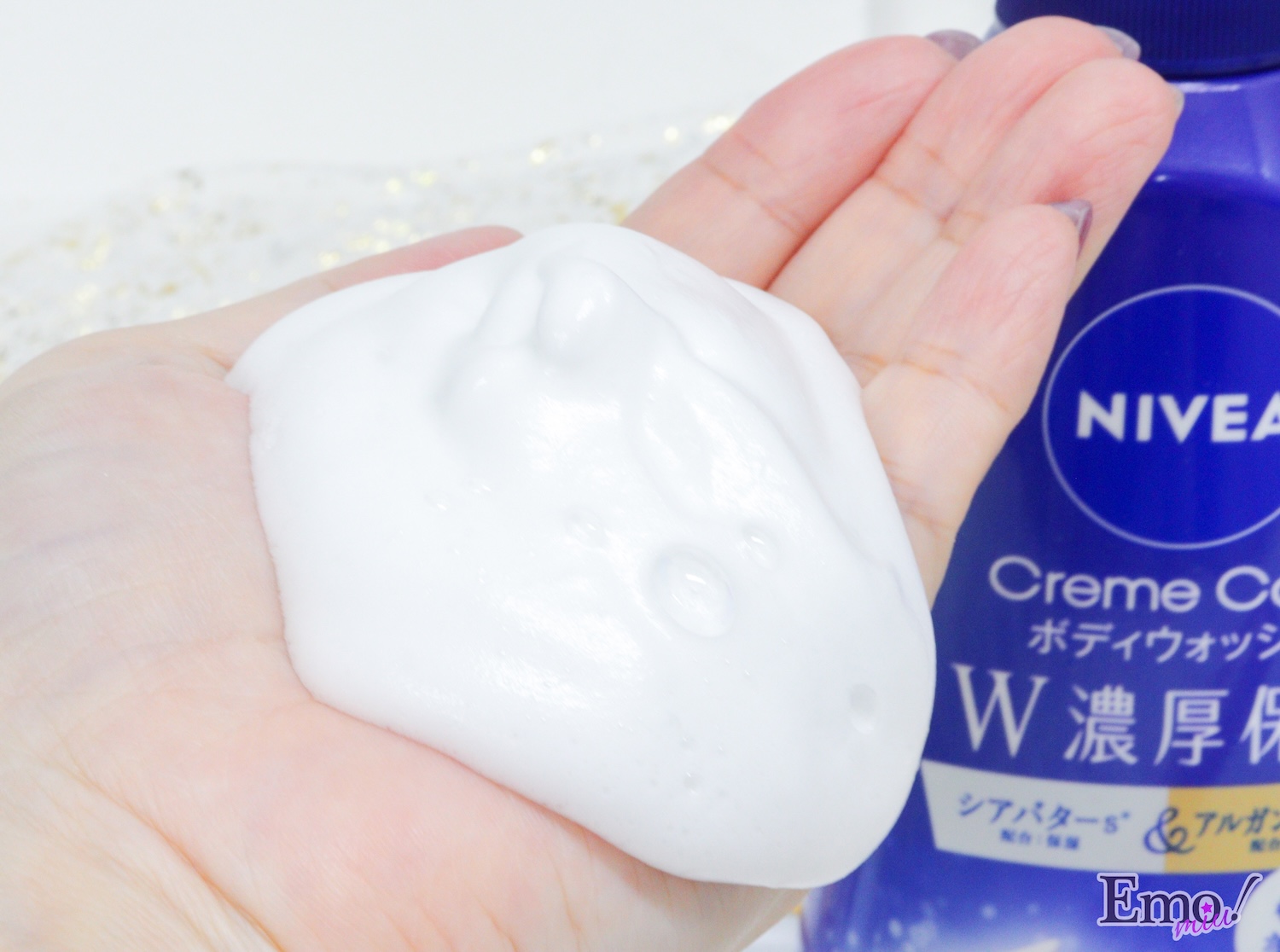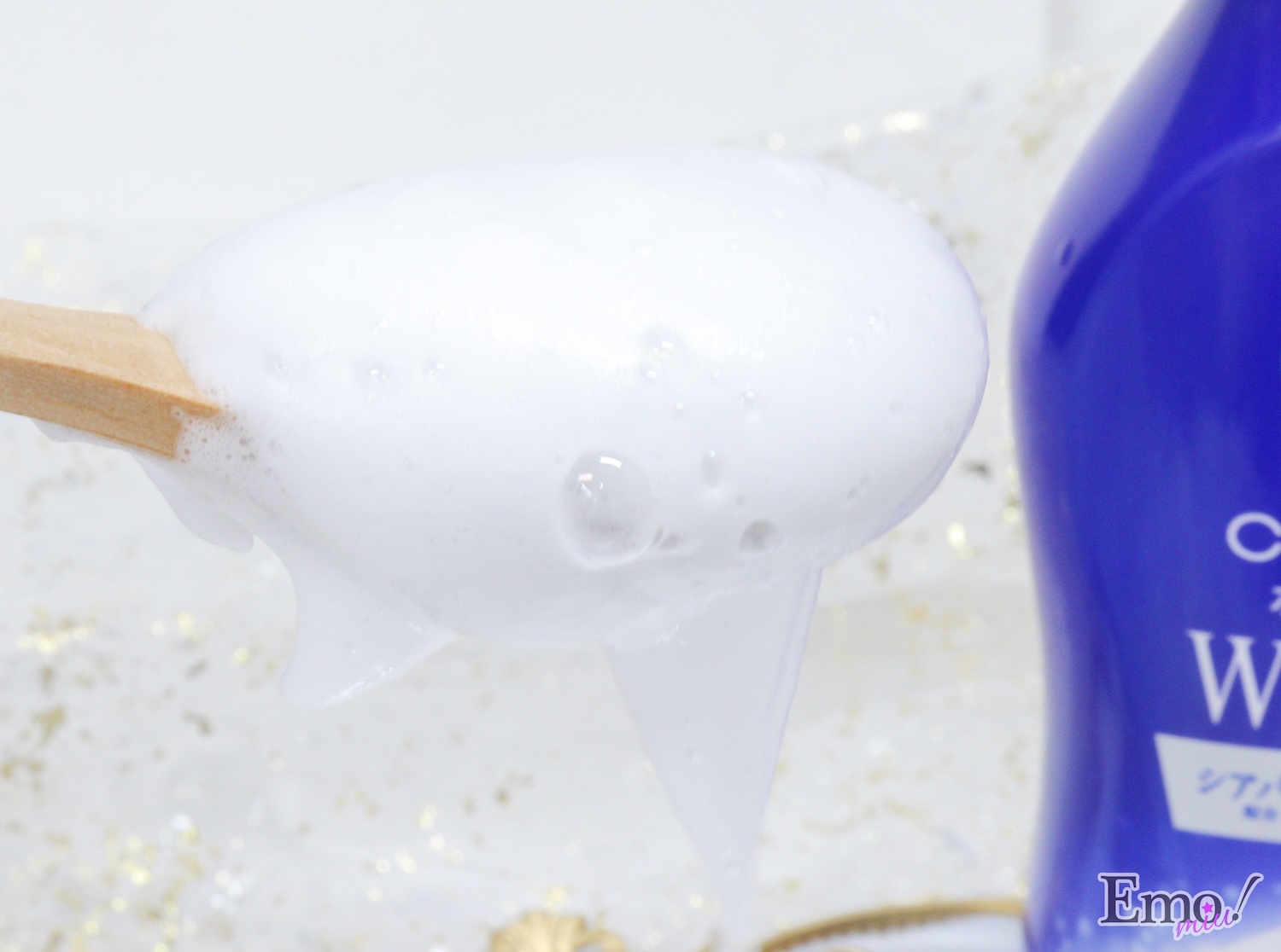 もっちりの濃密泡は、ホイップクリームのように綿密さで泡を逆さにしても落ちないくらいと、まさに摩擦レスなボディケアができる。
