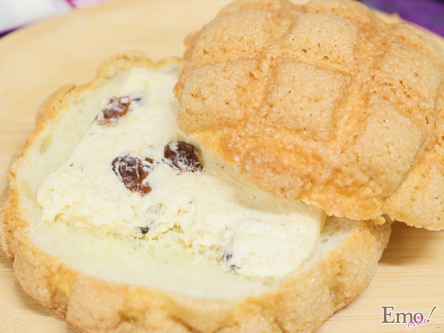 バタービスケット生地をかぶせたメロンパンに、ラムレーズンバタークリームをサンド。