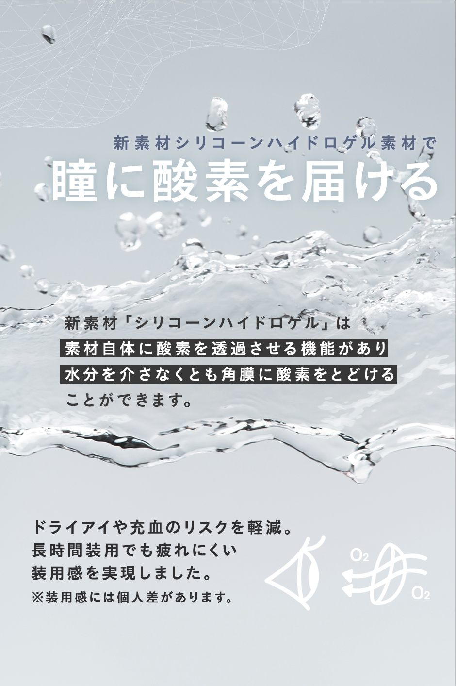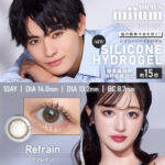 瞳に酸素を直接届けられる『シリコーンハイドロゲル素材』のレンズで、瞳の酸素不足を防ぐとともに、充血リスクを軽減し、1日中快適な着け心地に。酸素透過率(DK/L値)は187DK/Lと当社従来品の約15倍を実現。新色は、淡いグレーの水光デザインで、涙のように潤んだ瞳をキープするTear Tint(ティアティント)と、瞳をほんのりトーンアップさせる2色のベージュで、黒目や奥目でもまばゆい光をまとった透明感あふれる瞳が叶うRefrain(リフレイン)の2色!