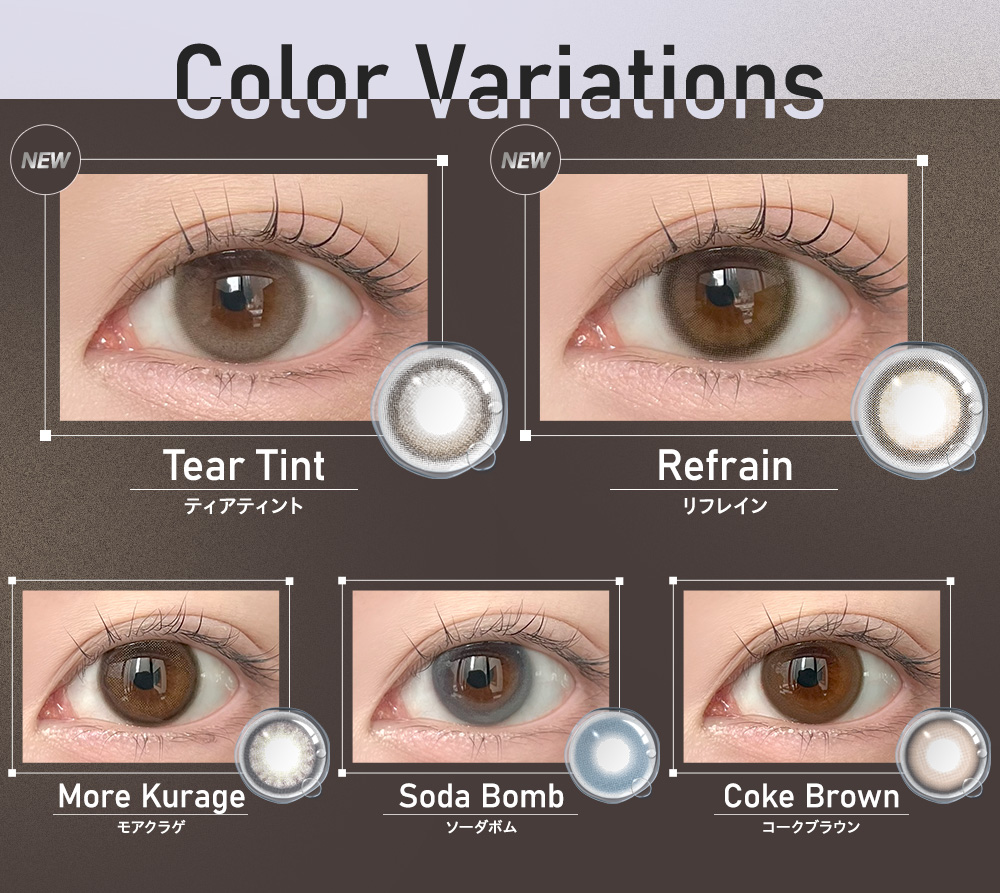 瞳に酸素を直接届けられる『シリコーンハイドロゲル素材』のレンズで、瞳の酸素不足を防ぐとともに、充血リスクを軽減し、1日中快適な着け心地に。酸素透過率(DK/L値)は187DK/Lと当社従来品の約15倍を実現。新色は、淡いグレーの水光デザインで、涙のように潤んだ瞳をキープするTear Tint(ティアティント)と、瞳をほんのりトーンアップさせる2色のベージュで、黒目や奥目でもまばゆい光をまとった透明感あふれる瞳が叶うRefrain(リフレイン)の2色!