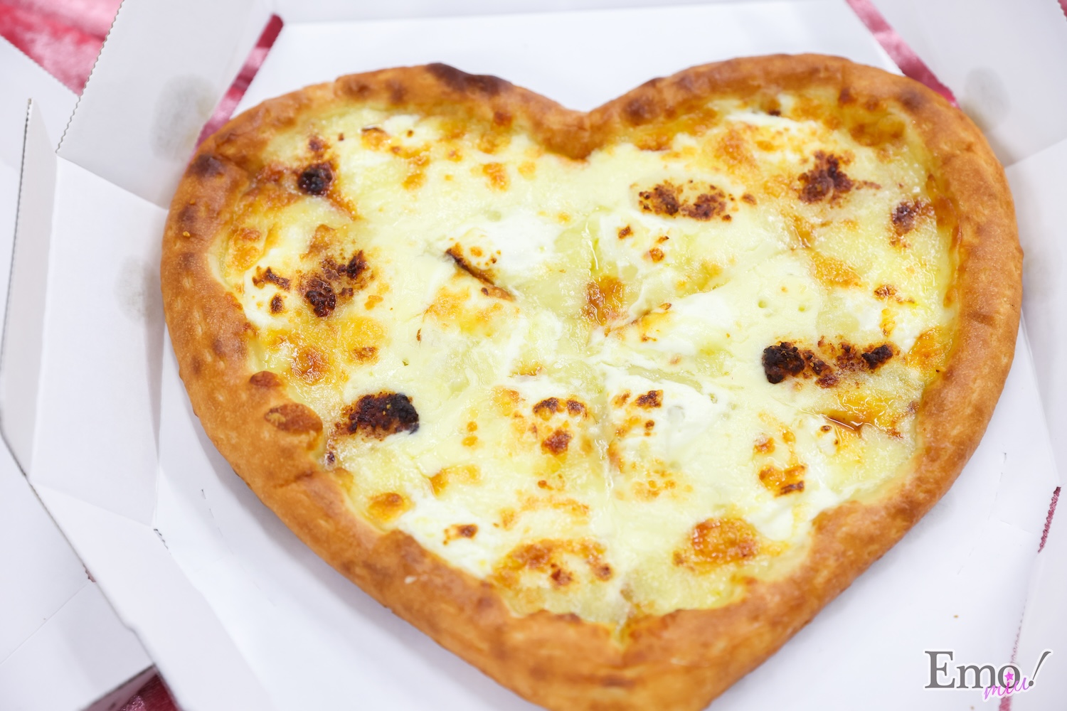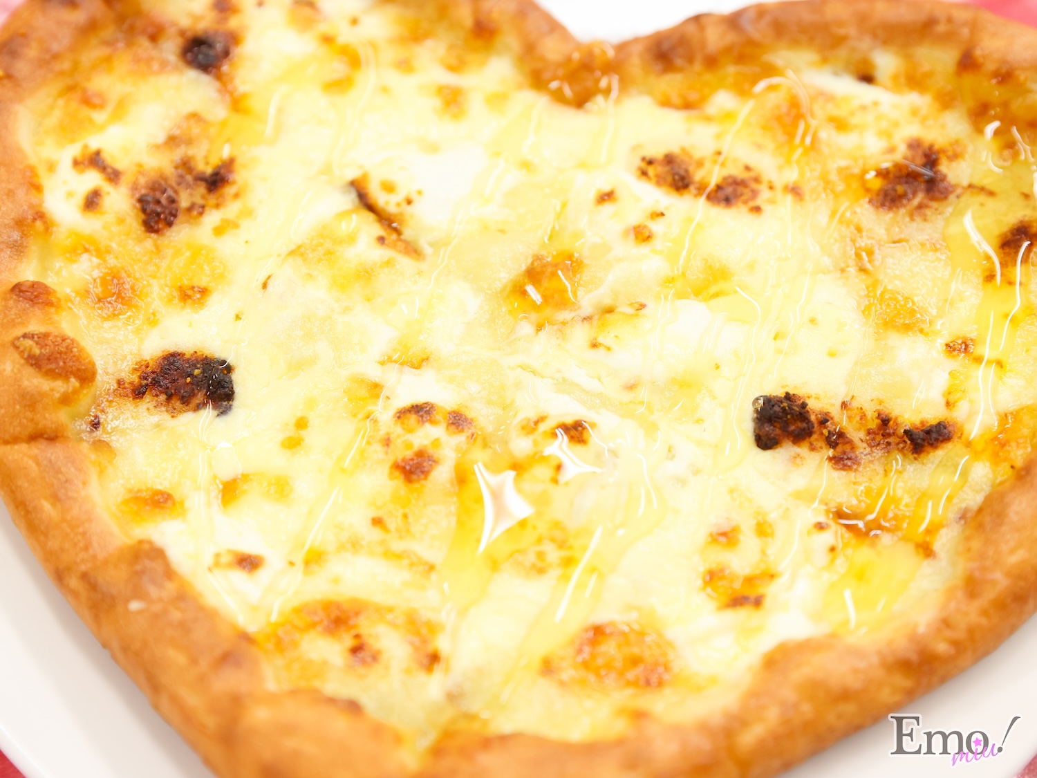 イタリア産モッツァレラ、カマンベールチーズを使用した濃厚なとろけるチーズ、口どけの良いクリームチーズなど、こだわりのチーズをたっぷりの真っ白なハート型ピザ。