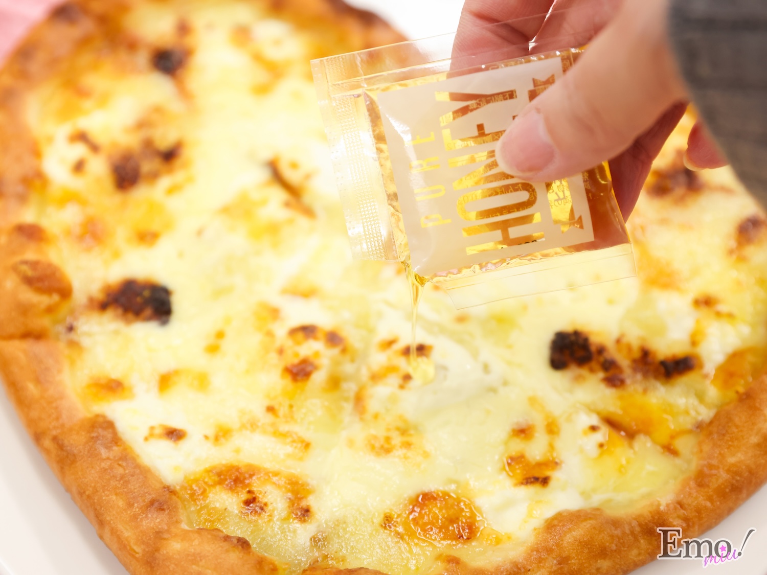 別添のハチミツをピザにかけて楽しめ、味変できるのも魅力!
