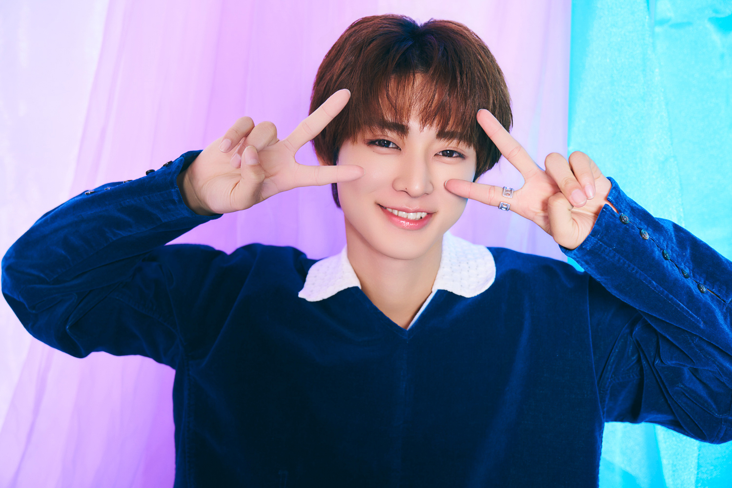 [衣装]シャツ¥22,000(THE SOUL AGE/JOYEUX)、ベロアトップス¥22,800(Ripo trenta anni)、パンツ¥53,900(NaNo Art/JOYEUX)、ネックレス¥71,500/ブレスレット¥88,000/リング¥66,000(EINS by Grosse)