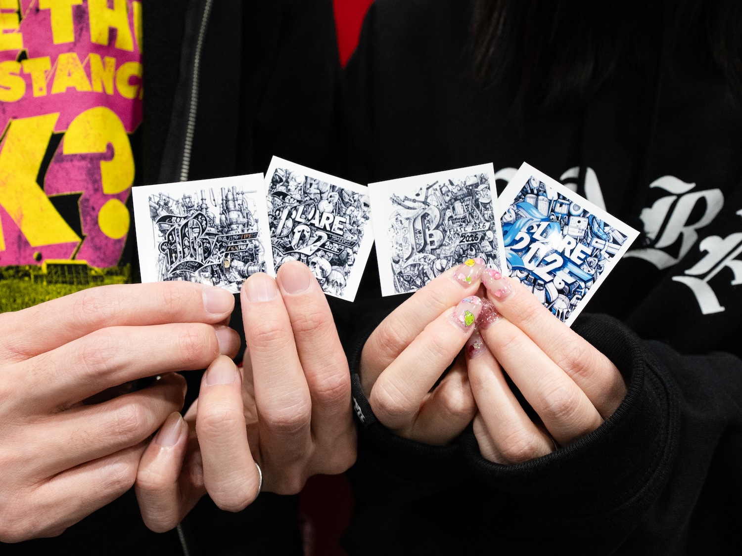今回の目玉企画のひとつが、生成AIツールを使った『BLARE FEST. 2026』公式ロゴのリデザイン体験。参加者はアドビが提供する生成AI【Adobe Firefly】に自分がどのようなロゴデザインにしたいかテキスト(プロンプト)を入力するだけで、世界にひとつだけのオリジナルロゴがものの数分で生成でき、「推しの世界観をビジュアル化したい」という想いを直感的に表現することができる。色味、質感、雰囲気まで言葉で指定できるから、“自分の解釈の推し”をそのままデザインにできるのが強み。しかも今回のブースでは、完成したデザインを指定のハッシュタグを付けてSNS投稿すると、その場でステッカー化し無料で配布された。