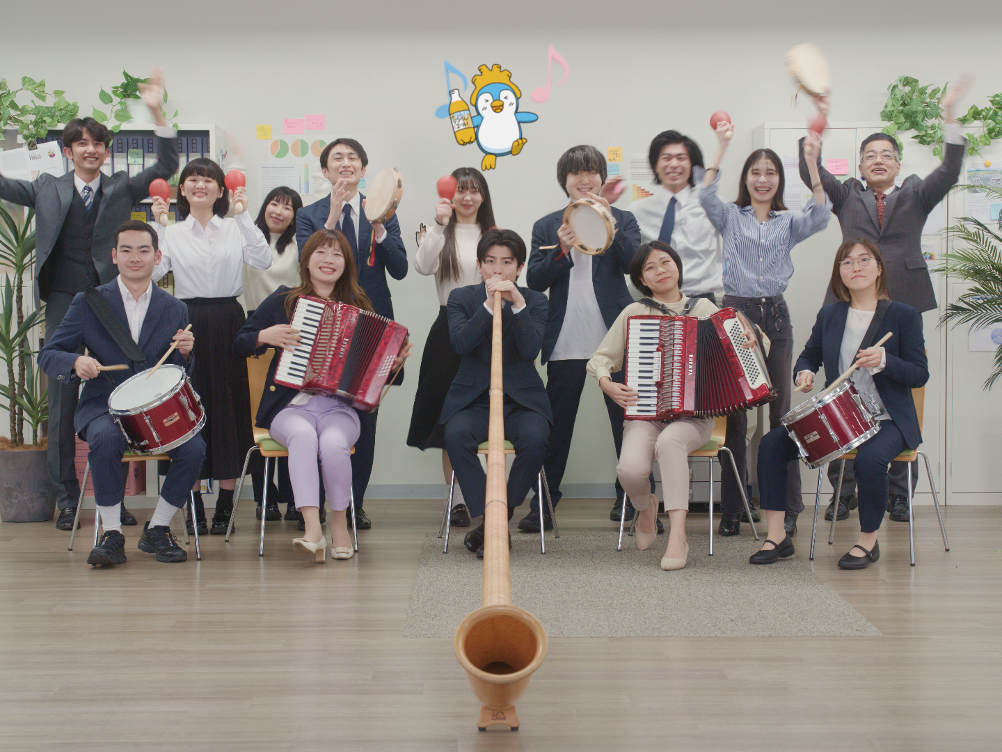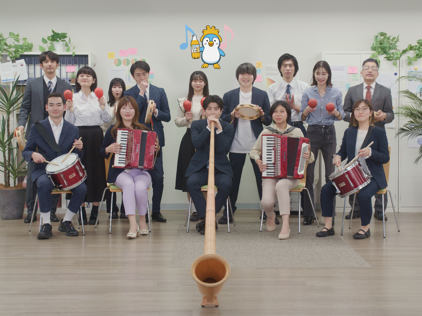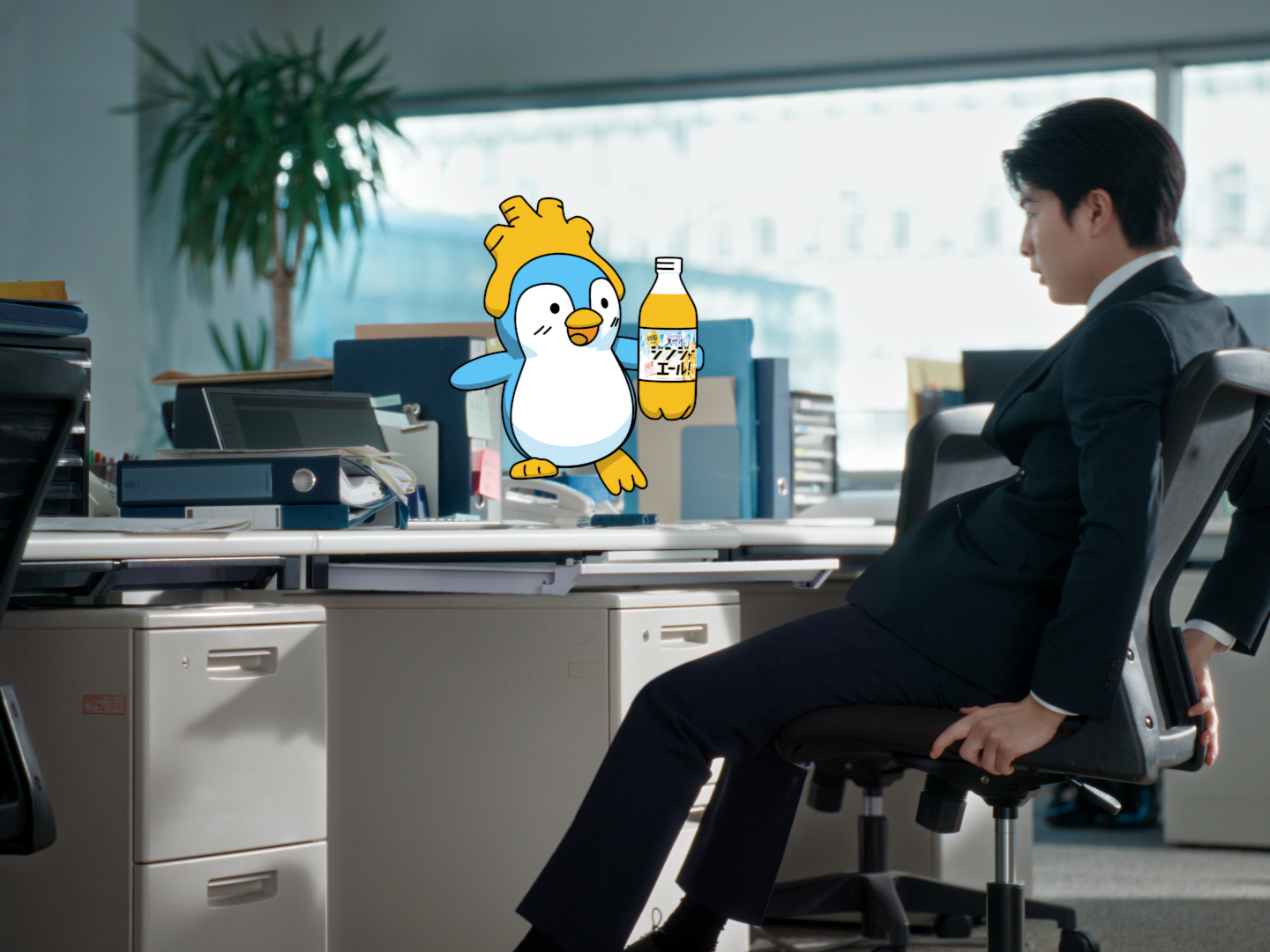新WEB CM「ジンジャー!ジャジャーン!」篇では、オフィスを舞台に、サラリーマンに扮した柏木悠が登場。任された仕事が捗らず焦っていると、突然デスクの引き出しから現れた謎のペンギン「ジンペン(ジンジャーペンギン)」にペットボトルを渡され、それを飲んだ柏木にぐんぐん力がみなぎっていくストーリーを通じて、働く人の昼のエネルギーチャージを後押しする「サントリー天然水特製ジンジャーエール」を訴求していく。