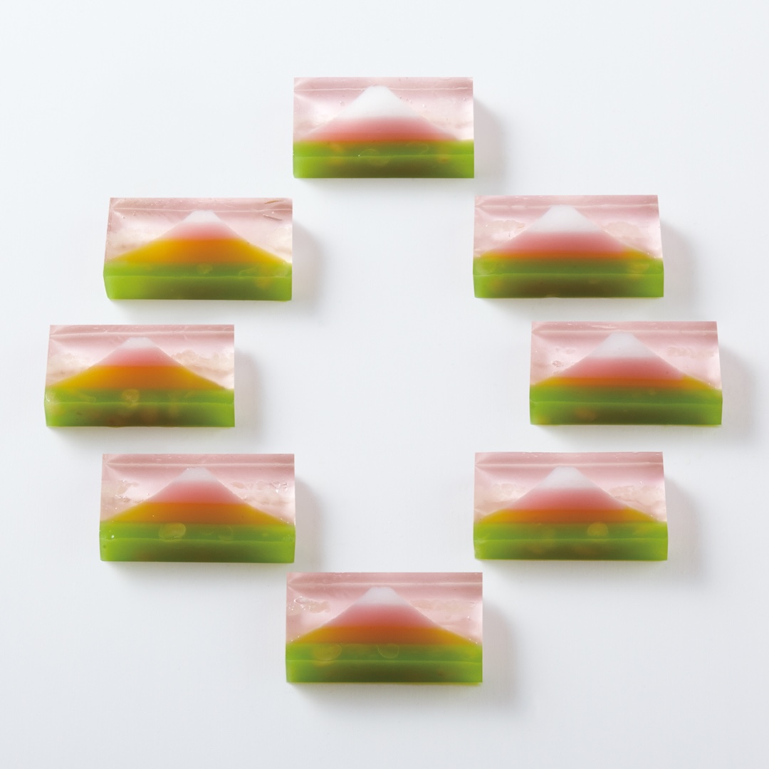 その四季折々、豊かな自然の移ろいをぎゅっと一棹に閉じ込めた、切り分ける箇所により異なる日本を象徴する富士山の春の彩りを表現した桜風味の羊羹。一面に咲く菜の花畑から、やわらかな桃色の美しい桜景色までの移ろいを1本で表現。切り分けるごとに表情が変わり、味わいとともに視覚でも楽しめる。