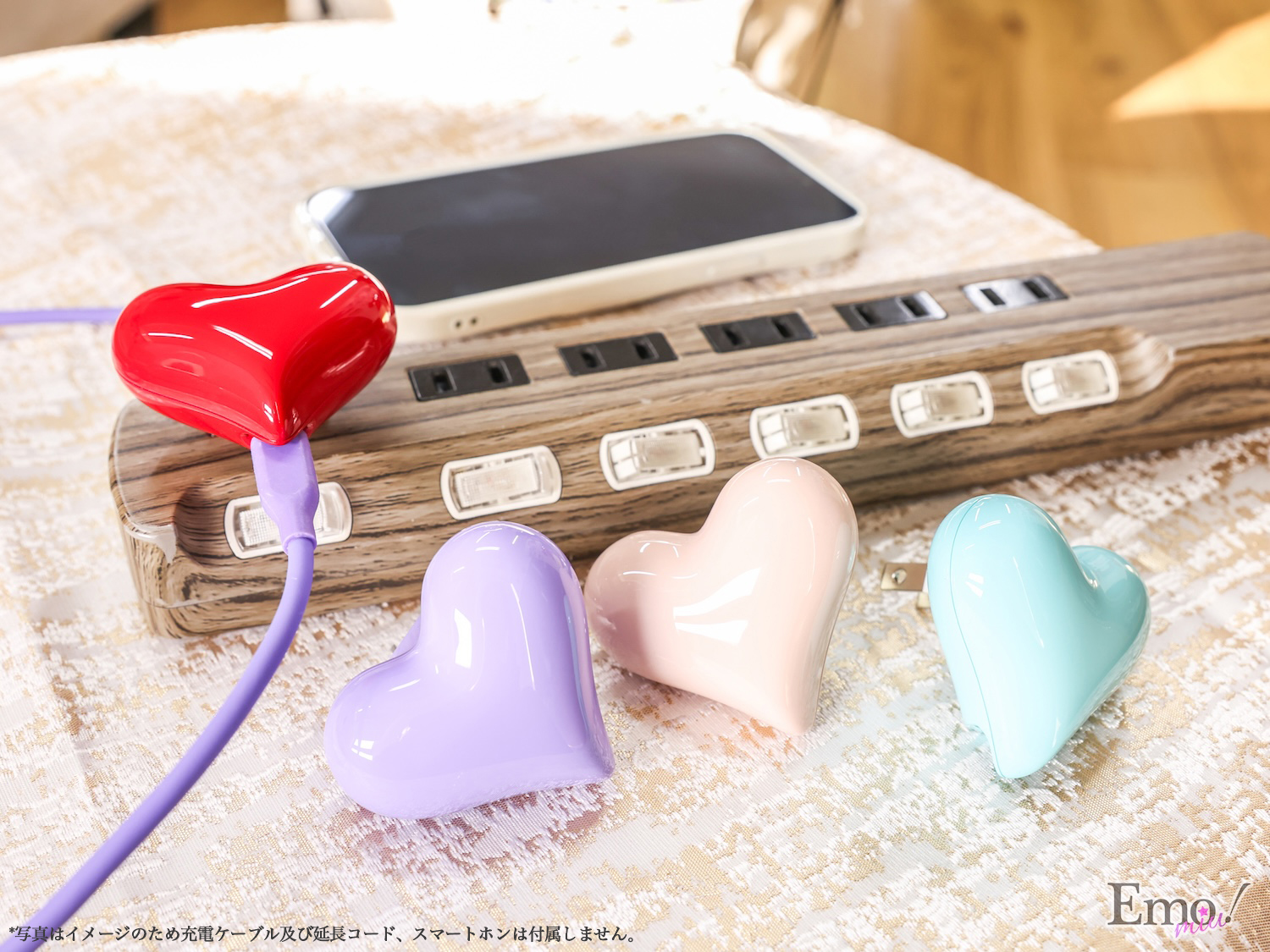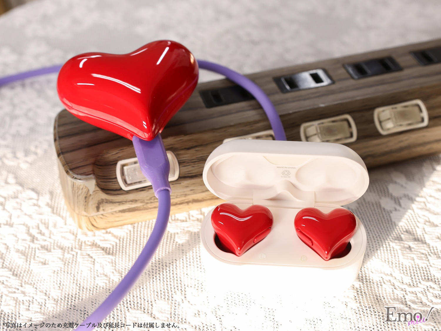 ハート型の充電器「HeartBuds(Charger)」は、ハート型の充電器です。USB(Type-C)コネクタが使用でき、出力は最大1.5A(7.5W)。スマートフォンや周辺機器の充電はもちろん、お部屋、職場のデスクのインテリアのアクセントとしても楽しめる。また、イヤホンの『HeartBuds Pro』はRed・Pinkの2色展開で、充電器は4色のカラーバリエーションで展開中。