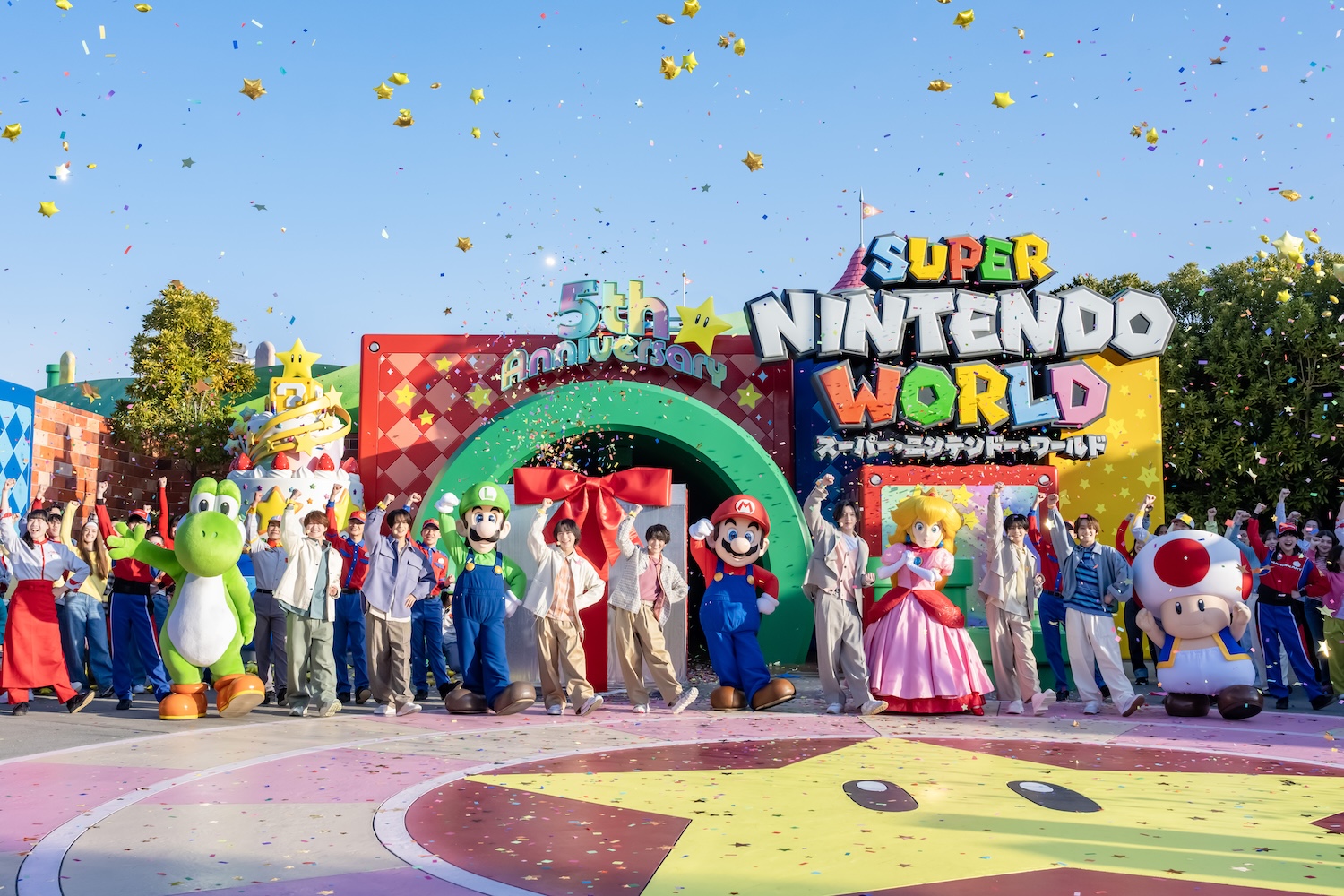 本日午前7時頃、『スーパー・ニンテンドー・ワールド』の入口『スーパースター・プラザ』でアニバーサリー・セレモニーを開催。『スーパー・ニンテンドー・ワールド』の大ファンである大人気グループ「なにわ男子」が全員集合、マリオとルイージ、ピーチ姫やヨッシー、キノピオ、そして特別招待ゲストとともに、エリア開業5周年を超元気に祝った。