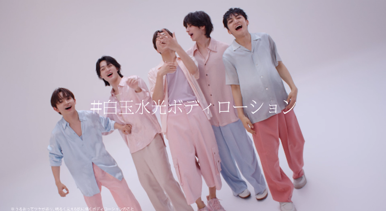 繊細な表情と所作で張りつめた空気を生み出す。そこから一転、『グルタヒア ボディローション』を肌に伸ばしてうるおって明るく輝く“白玉水光肌”をまとい、キレのあるダンスや爽やかなウォーキングを披露。静と動を行き来する構成の中で、グループとしての一体感と、それぞれの個性が鮮やかに際立つ。