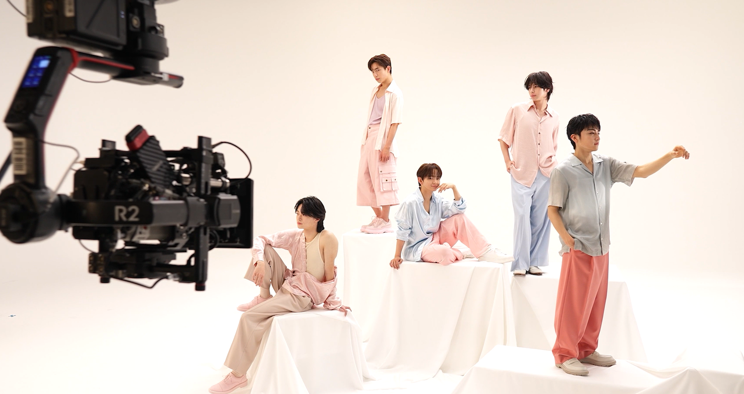 横一列で歩くシーンの撮影では、音声収録のない撮影ではありながら、メンバー同士が思いおもいの言葉を叫び合いながらテンションも最高潮に。カメラが止まるとすぐにふざけ合う姿も見られ、スタジオには終始笑い声が響いていた。ステージ上で見せるクールな表情とはまた違う、飾らないリアルな表情が垣間見える、笑顔あふれるひとときに。