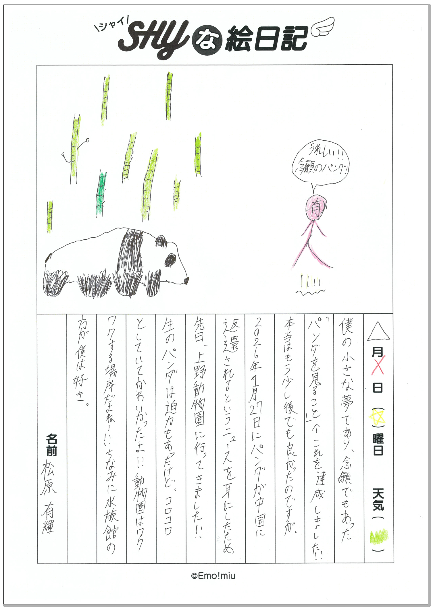 今週の担当は、シャイピンクの【松原有輝】(まつばら ゆうき)くん💌 念願だったという“パンダ”に会いに行った日のことを絵日記にして届けてくれました🐼 オフショットムービーでは、松原くんが撮影した貴重なパンダ動画を読者のみなさんにもおすそ分け!! パンダにまつわる雑学も!! オフショットムービーを要チェック✓