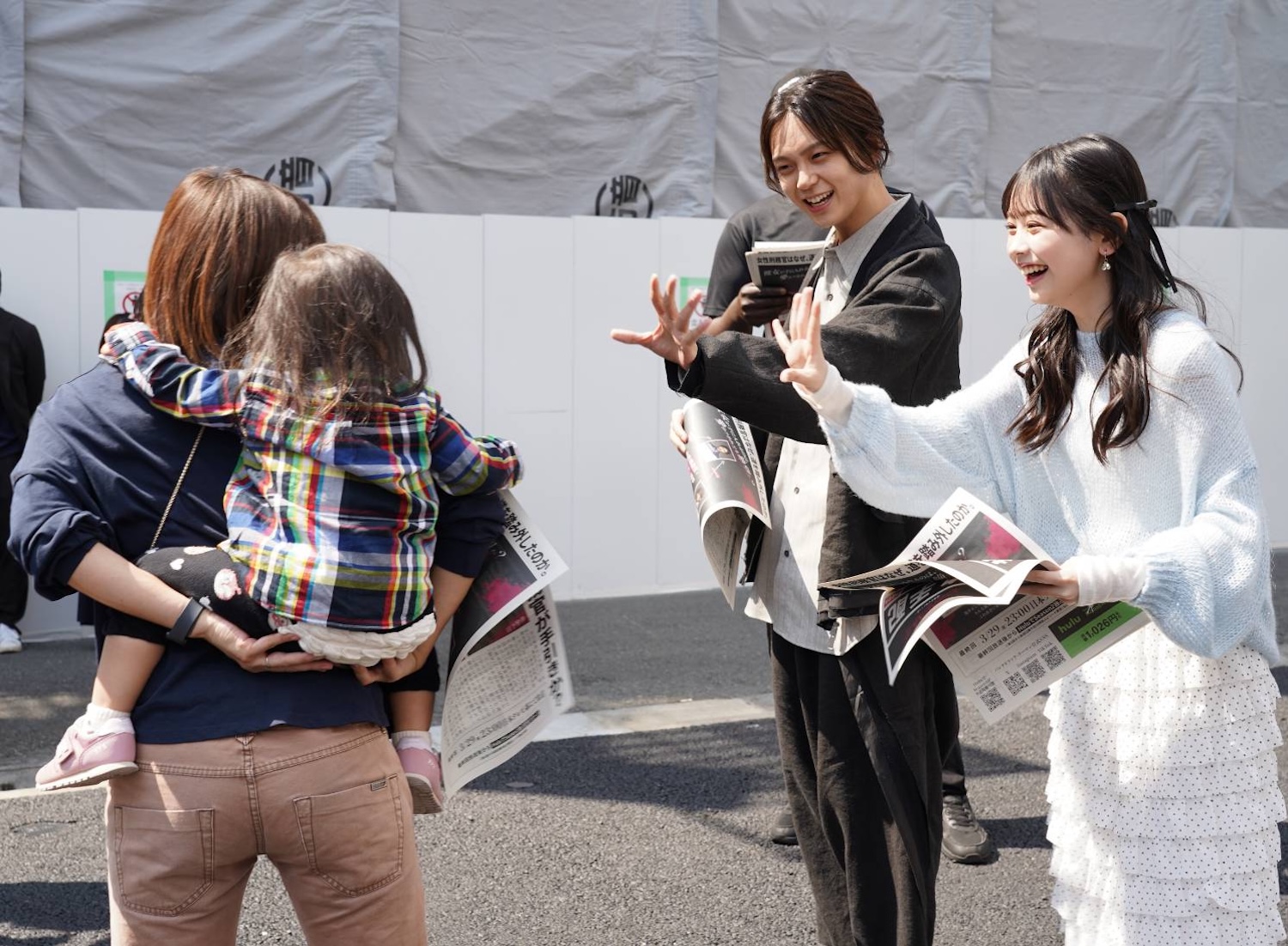 「パンチドランク・ウーマン」の壁面グラフィックが展示された竹下口パークイベントスペースに姿を現した沢村さんと梶原さん。二人の手にはこずえと怜治の写真が大きく写った指名手配(風)の号外が。家族連れも多く行き交う竹下口で出演者二人による号外の配布がスタート。イベントスペースで壁面グラフィックの撮影をしていた人が驚きながらも二人に近づき、ドラマの感想などを伝えながら号外を手にする姿も見られました。「本日ドラマ最終回です!」「23時からスタートします!」「号外お渡ししています!」「もらってください~」とコメントしながら配布していく2人。号外を手にした人からは「お母さんとおばあちゃんが好きなドラマ!」「これ、超面白い」といったドラマの感想などが聞かれる場面も。恥ずかしがって号外をもらいに行くのを躊躇っている子どもの姿もちらほら見られましたが、お父さんやお母さんに促されて照れながらも無事にゲットしてもらえました。小さいお子さんを見かけると二人の表情は一気に和らぎ、自然な笑顔に。号外を手渡した後には手を振ってさよならをしていた。