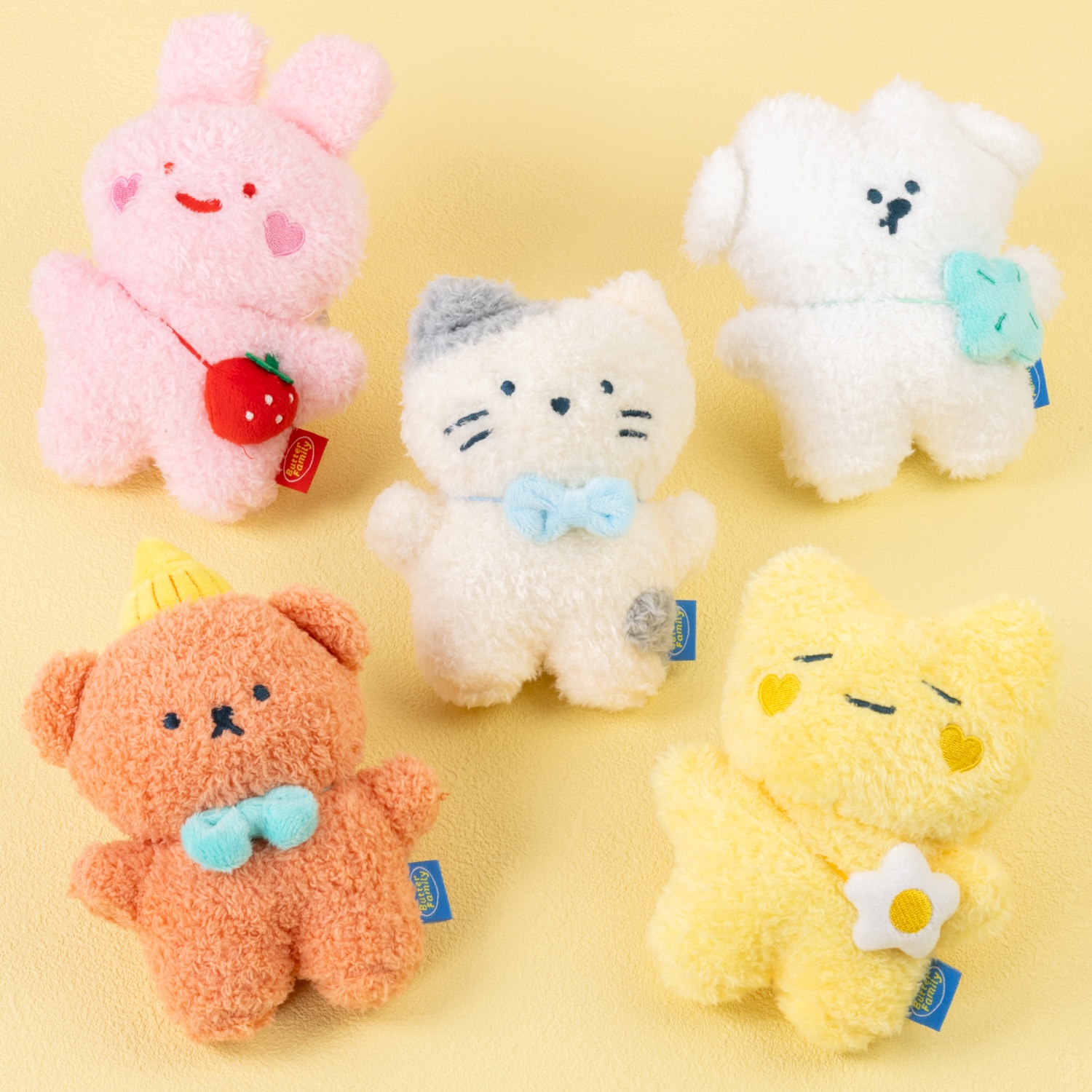 「BUTTER SHOP」の人気キャラクター「BUTTER FAMILY」は、デザートと動物を組み合わせた独創的な世界観と、思わず抱きしめたくなるようなふわふわのかわいらしさが魅力のキャラクターたちが揃う。