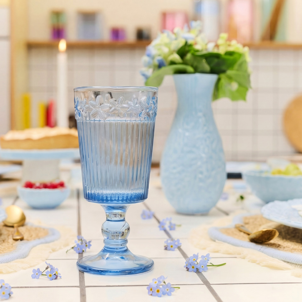 涼し気なワイングラスは普段使いにもぴったり。フラワーベースにお花を飾れば、ダイニングがぱっと華やかに。