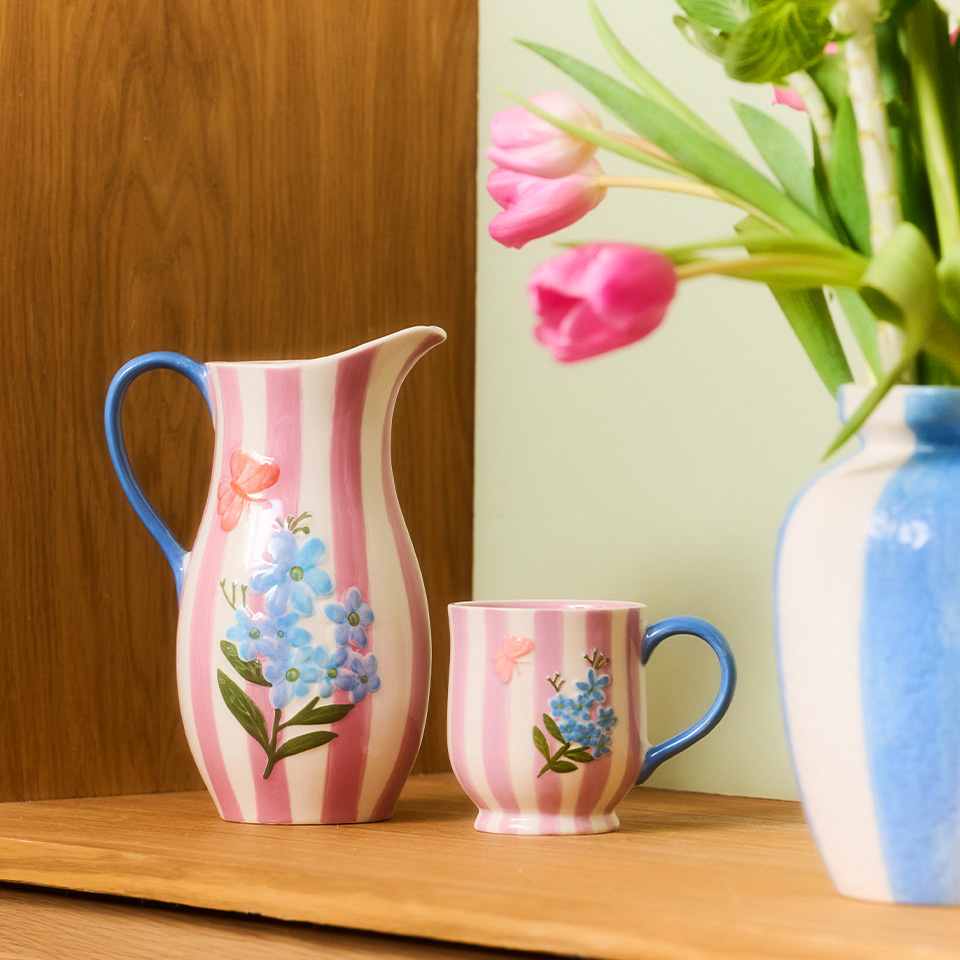 ピンクのストライプに、お花と蝶々をアクセントにしたシリーズ。セットで揃えると、より雰囲気が出るよ。春らしい軽やかな雰囲気が演出できる『ダイニングシリーズ』で日常生活にもトレンドを取り入れてみては?