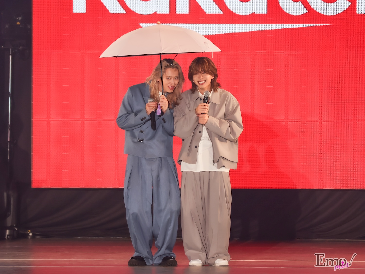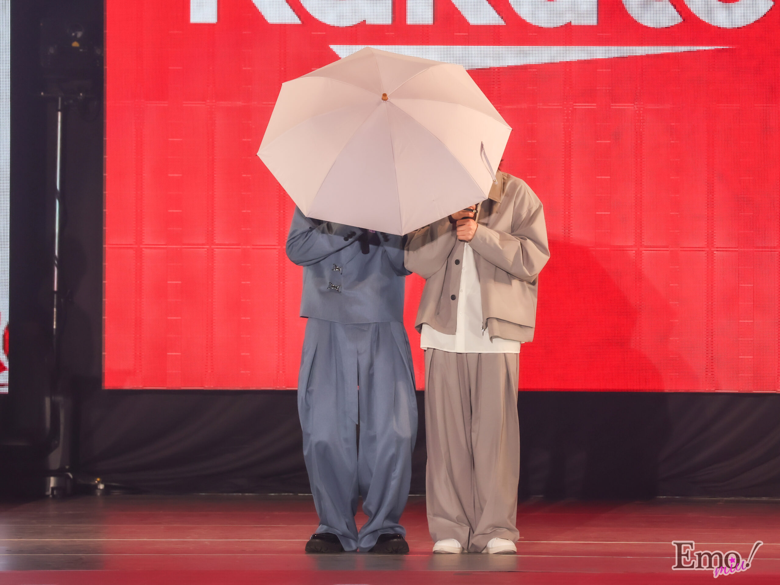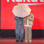 これからの時期に欠かせない日傘の遮熱率をステージ上のビームライトで再現。もーりーがカメラが狙っているのを察知して、傘で視線をガード。からの、この表情。