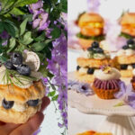 また、都内有名ホテル出身のパティシエが送る今回のこだわりのアフタヌーンティーは、妖精たちが紡ぐ甘く優美な藤の世界をテーマにした『Wisteria Fairy Garden Afternoon Tea』。葡萄ソルベとフロマージュブランムース、ホワイトチョコ、メレンゲのグラデーションを楽しむ藤色パルフェをはじめ、蝶のカシスムースに紫芋タルト、その他数種類のベリーをふんだんに使用した5種のスイーツと、旬のなすとモッツァレラを重ねたラザニアに、淡い藤色のバンズを使った海老カツバーガーなど、5種のセイボリーが並ぶ。
