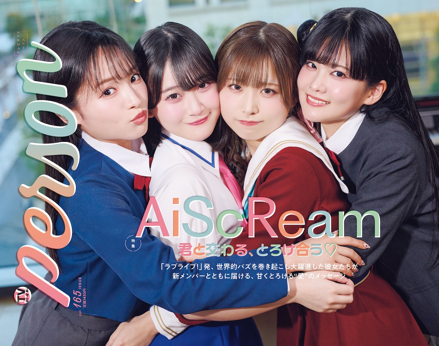 裏表紙に登場するのは、「ラブライブ!」から誕生したスペシャルユニット・AiScReam。昨年「愛❤︎スクリ~ム!」で世界的バズを巻き起こし大躍進した彼女たちがこの春、三宅美羽と遠藤璃菜を新メンバーに加え、4人体制で再始動することに。「君と交わる、とろけ合う❤︎」と題して、どこよりも早い撮影&インタビューで、まさに“甘くとろける”新生AiScReamの魅力に迫る。