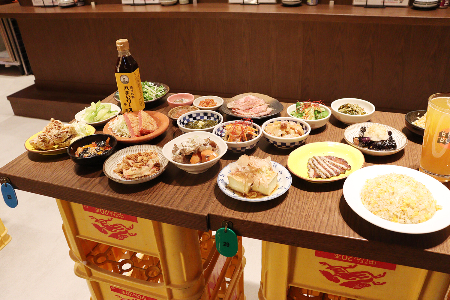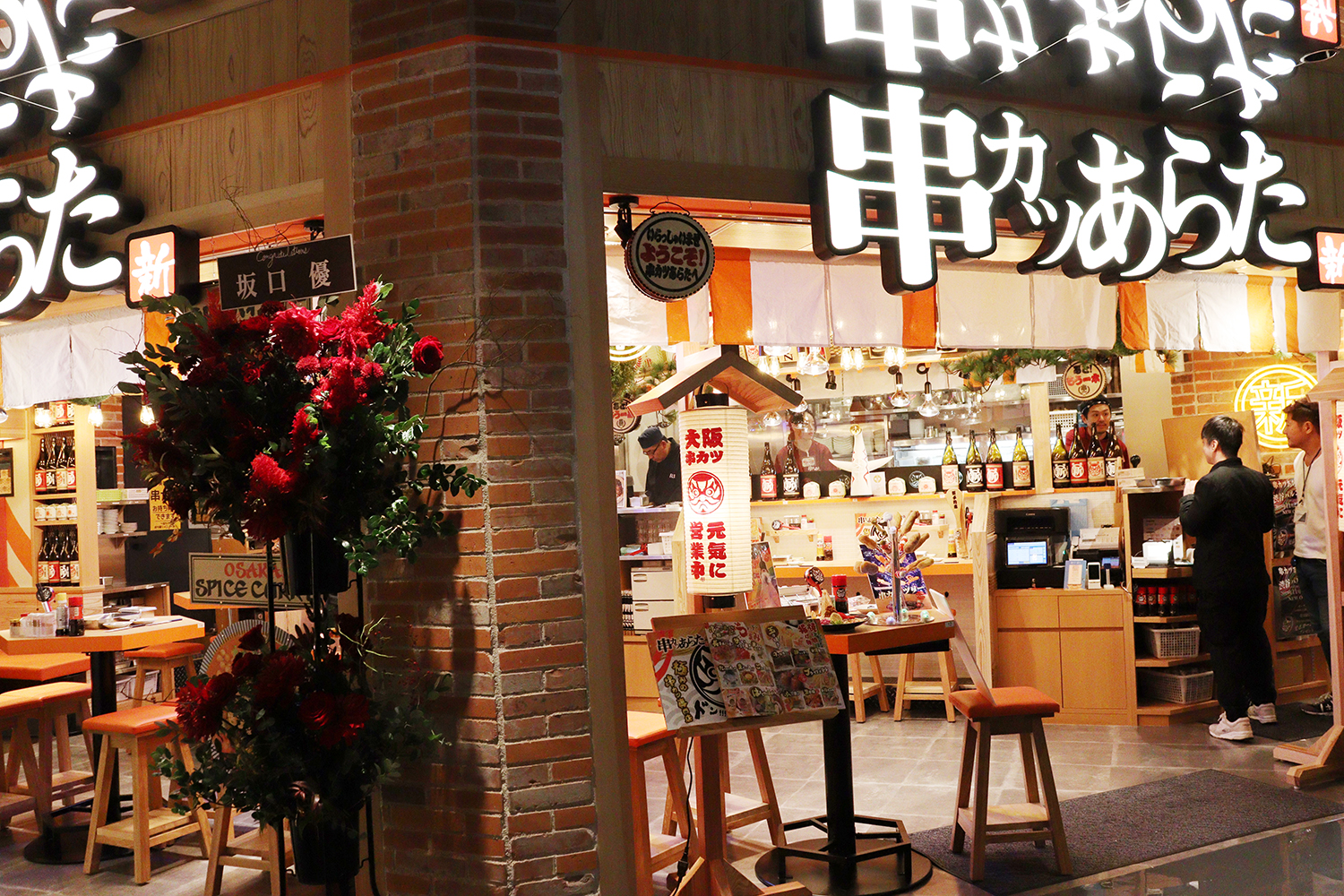 独創的な空間が広がる、B1Fは、ラーメン・寿司などを始め、ハンバーグ専門店や、串カツ、レストランなど28店舗が並ぶ。