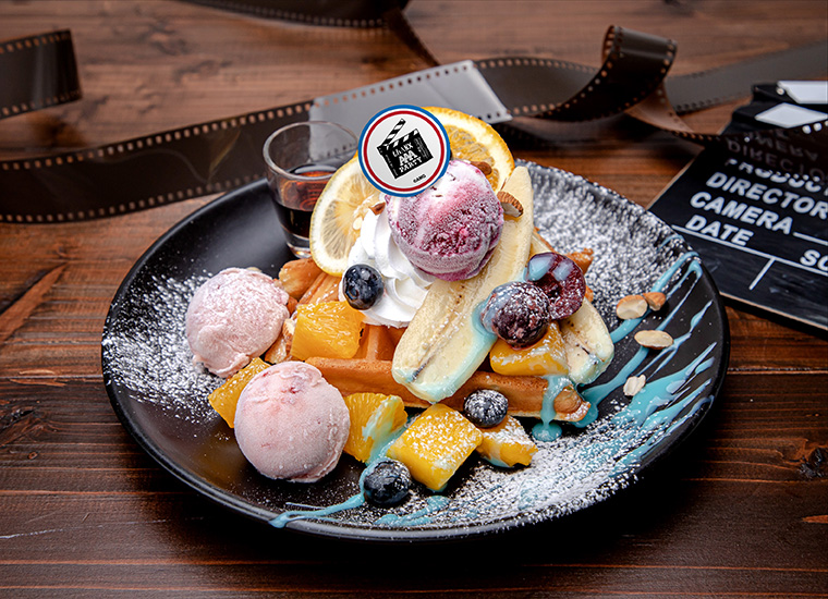 メンバーカラーの果物をワッフルの上に散らした爽やかなスイーツ。練乳クリームが果物の甘みを引き立てている。