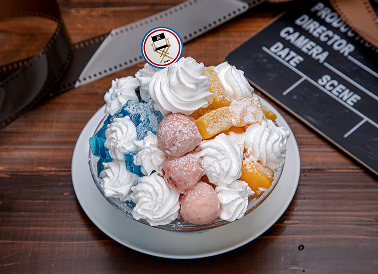 カラフルなシロップとフルーツ、ゼリー、アイスをたっぷり使った贅沢なかき氷。中にはパンナコッタ、白桃シャーベットも入って最後まで楽しめる。