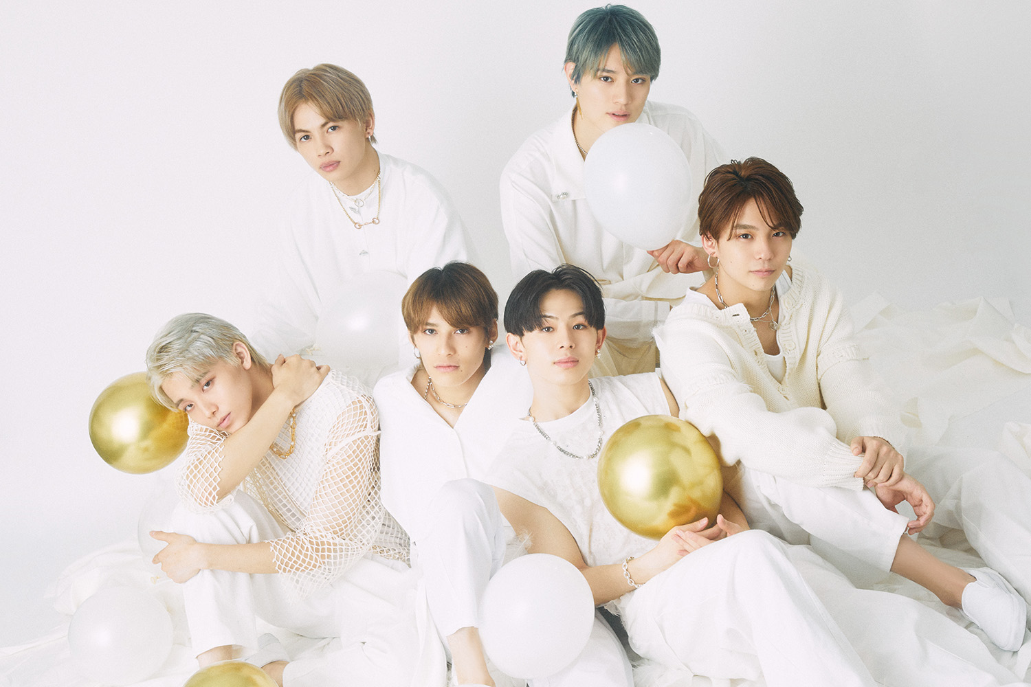 包み込むように優しい新曲にちなんで、今回はインタビューショットもホワイトを基調に撮影。羽やゴールドやホワイトの風船で遊びながら撮影した天使のような白ワンエンに注目!